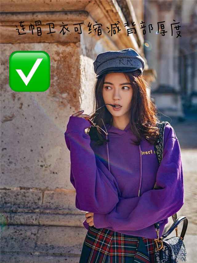 卫衣或羽绒服可以选连帽款,帽子上带点毛毛更好,能视觉收缩背部,显得单薄又可爱,还特别保暖。