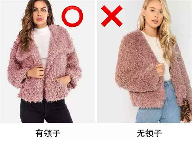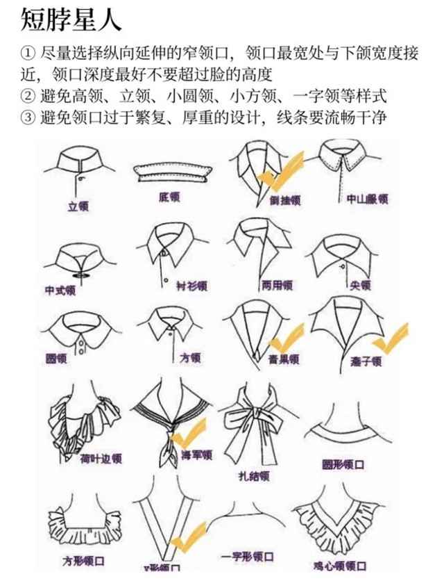 ⑵避开高领、立领、荷叶边领等包裹性强的款式,这些会让脖子更显短粗。