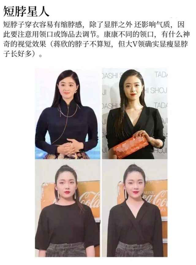 短脖容易有缩脖感,V领能视觉拉长颈部,显高显气质。参考蒋欣的穿搭,V领让她看起来更修长。