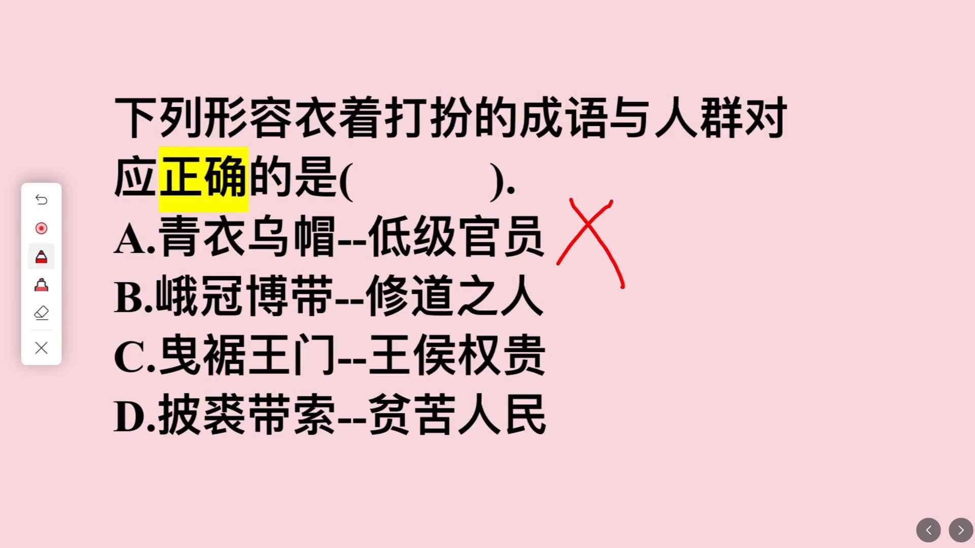 选项A:青衣乌帽这个成语出自《梅花零记》,它实际指的是平民百姓,而不是低级官员,所以对应错误。