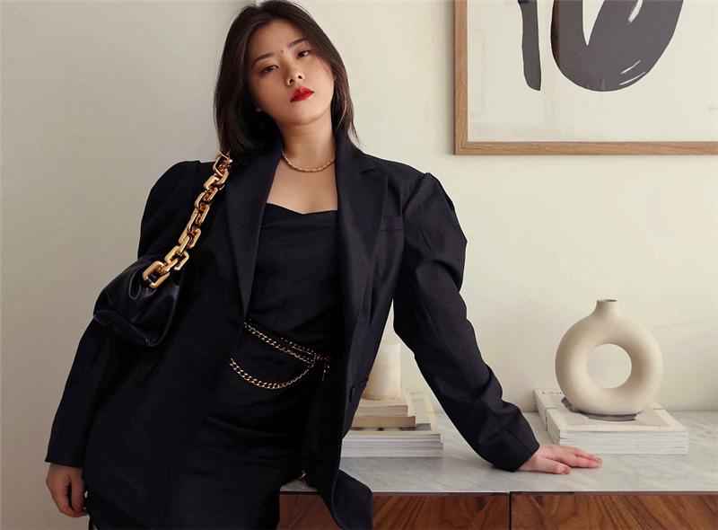 像博主这样,用黑色西装裤搭配收腰小外套,又帅又显瘦,