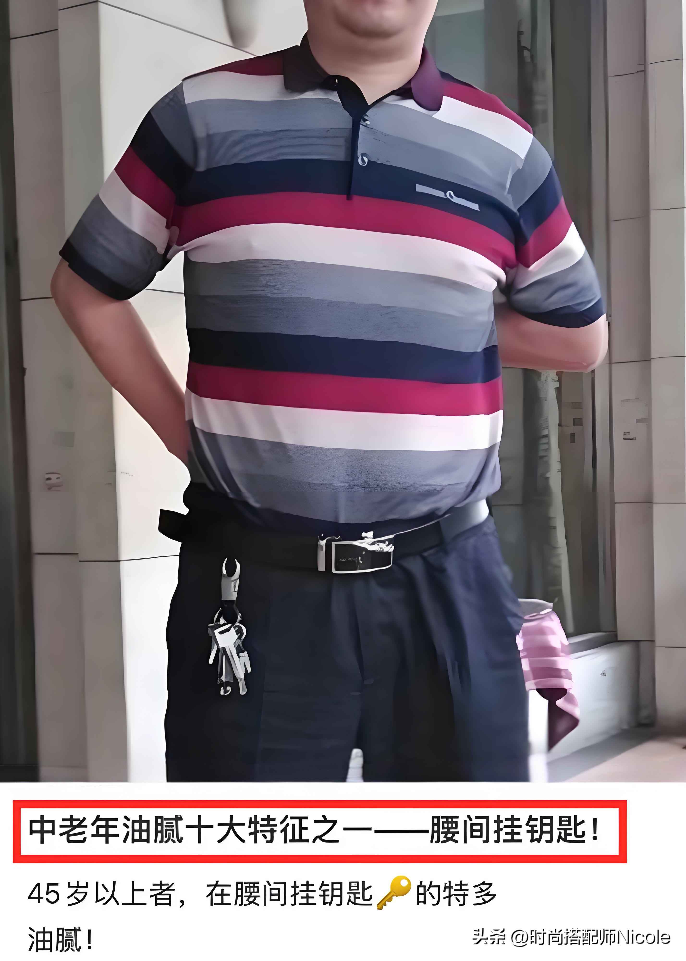 可见,“皮带外露”和“钥匙挂腰”这两个细节,简直是中年油腻感的“加分项”。对于160斤的大叔们来说,想显得清爽有型,第一步就是改掉这两个习惯!