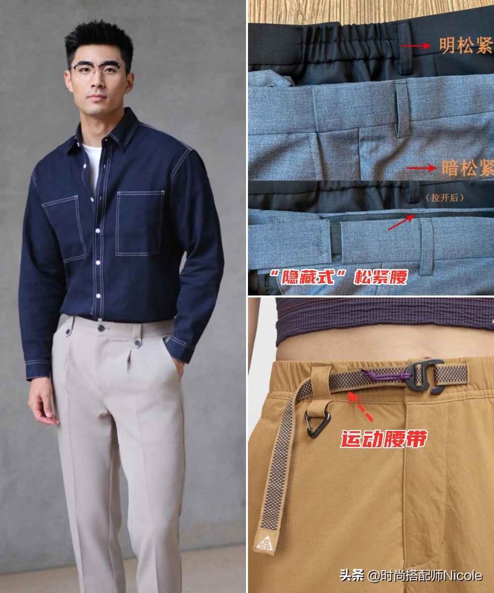 除了上衣,裤子也很关键。现在很多裤子设计有松紧腰头或侧边调节扣,比如慢跑裤、休闲裤,一些西裤也有类似款式。