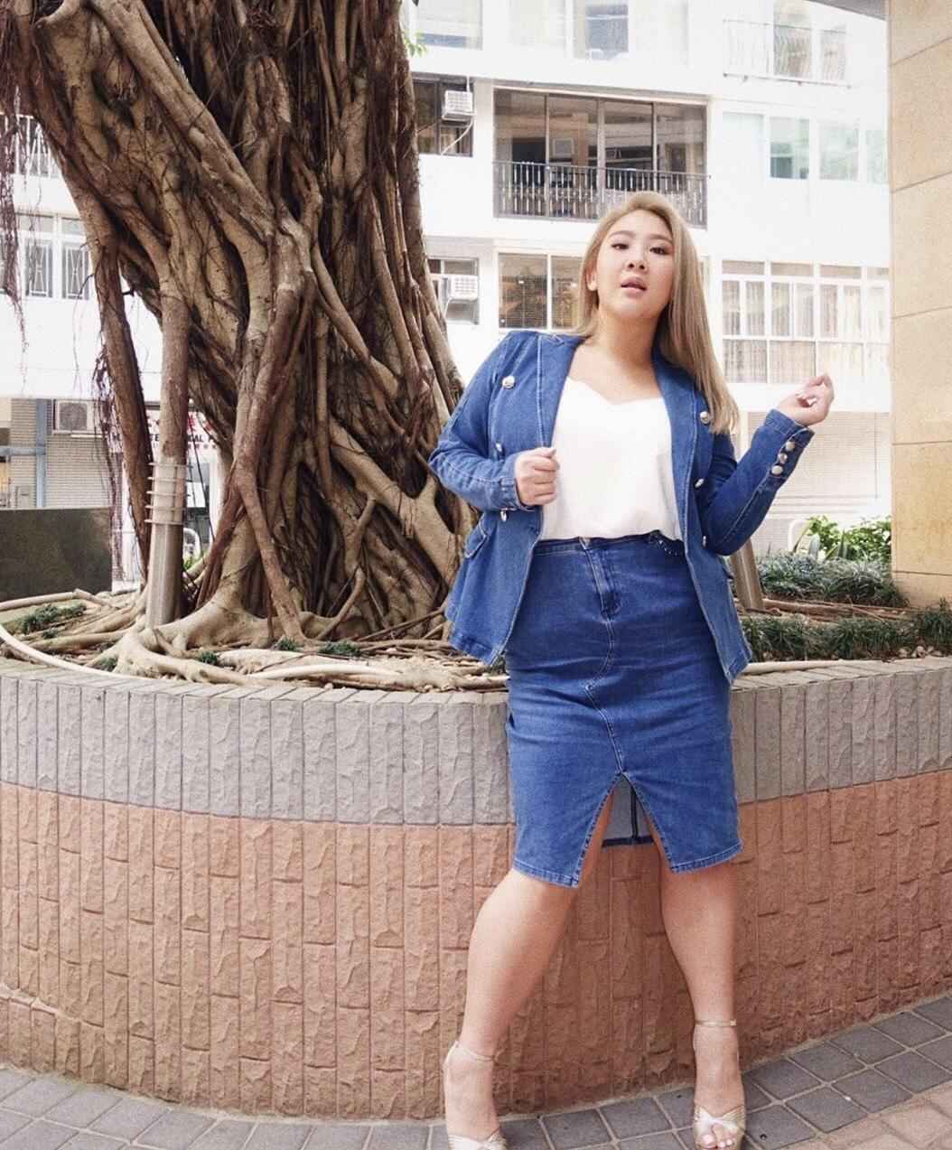 整套牛仔穿搭青春活力,郑欣宜用牛仔外套配开叉半身裙,吸睛又性感。牛仔面料硬挺但选对款式,胖女孩也能穿出范儿。