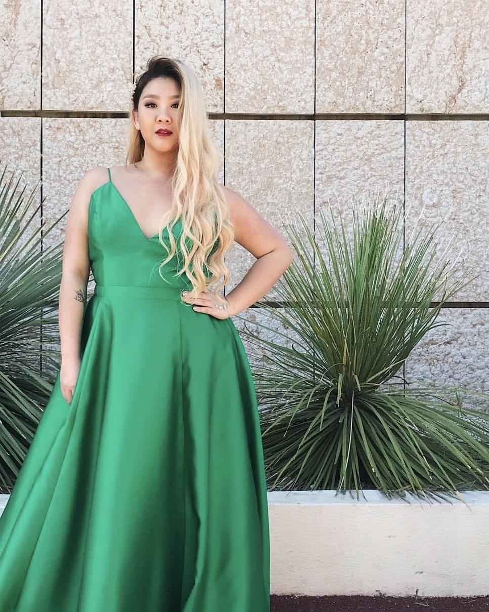 绿色缎面吊带连衣裙高级不俗气,长款设计加巧妙剪裁,显瘦又时髦。郑欣宜证明胖女孩也能性感出击。声明:文字原创,图片来自网络。如有侵权,请联系我们删除,谢谢!