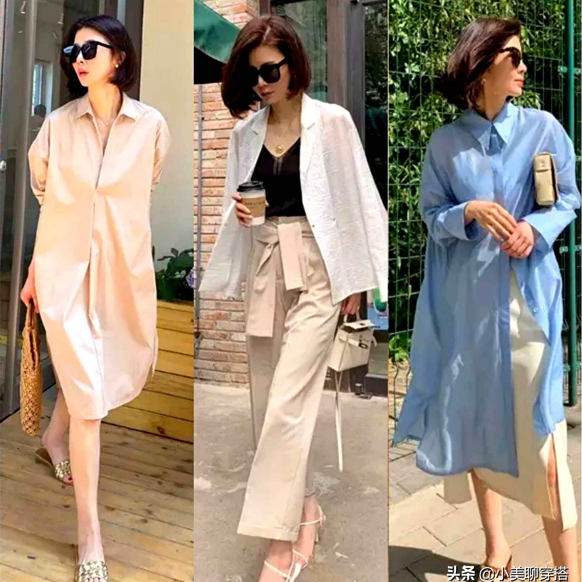 色彩思路:“三明治”穿法,上浅(衬衫内白)、中(连衣裙米白)、下浅(鞋),整体轻盈不压个。