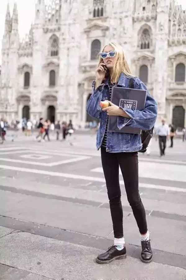 知道了原理,咱就来看看具体怎么搭。第一个不会出错的王牌组合,就是条纹衫配牛仔外套。这俩可以说是天生一对,复古休闲感拉满。关键是,牛仔的硬朗质感能完美中和条纹可能带来的“睡衣感”,瞬间注入活力。像短款的深蓝色牛仔外套,搭配细条纹衫,清爽又显白-6。这里玩法也很多,内搭的条纹衫可以选择红白条纹,与牛仔蓝形成小撞色,更有趣味;或者索性玩“全身牛仔”,用牛仔外套配牛仔裤,中间用条纹衫过渡,层次分明,帅气得毫不费力。