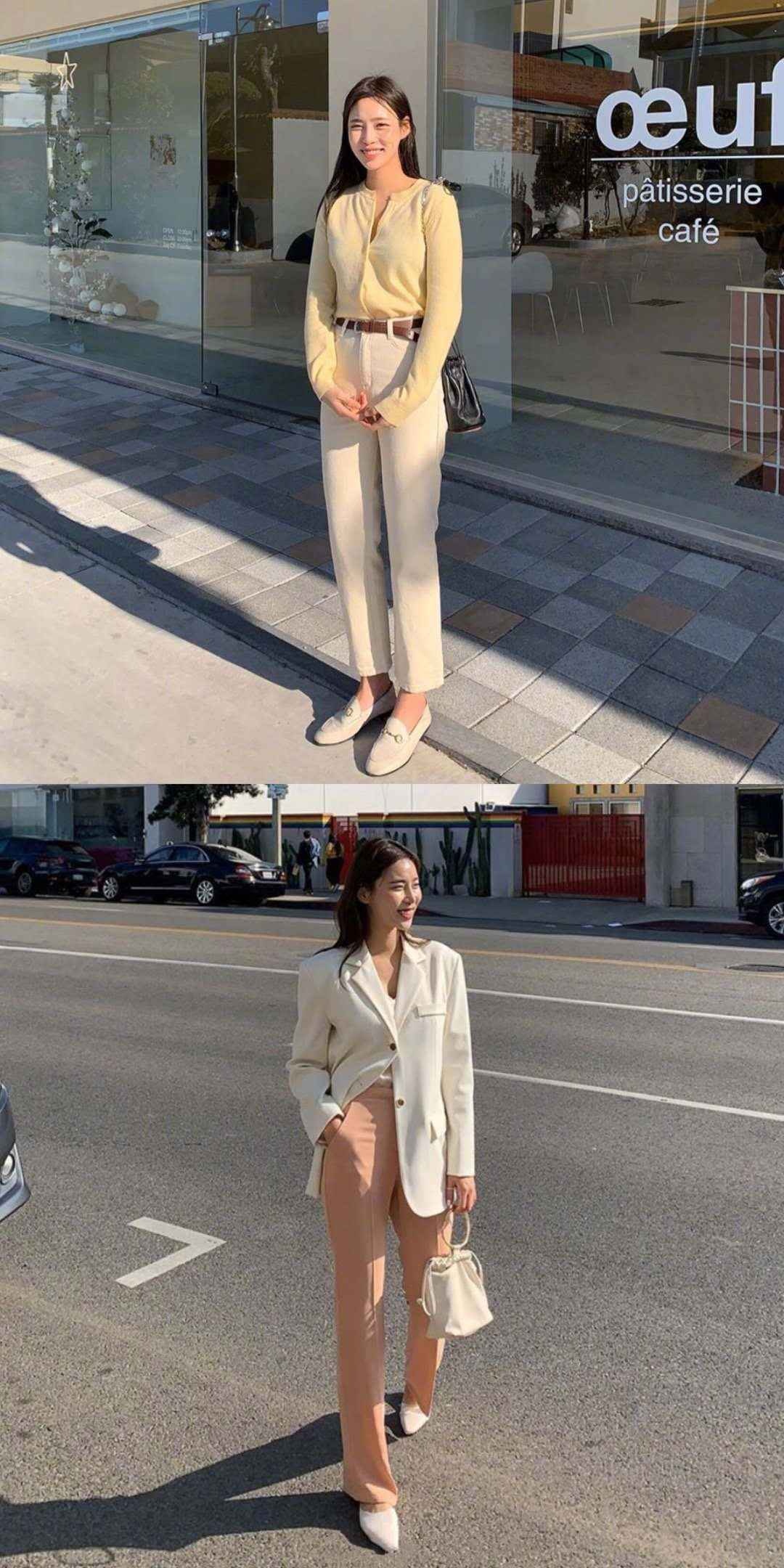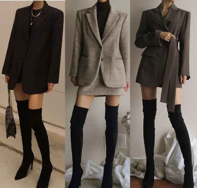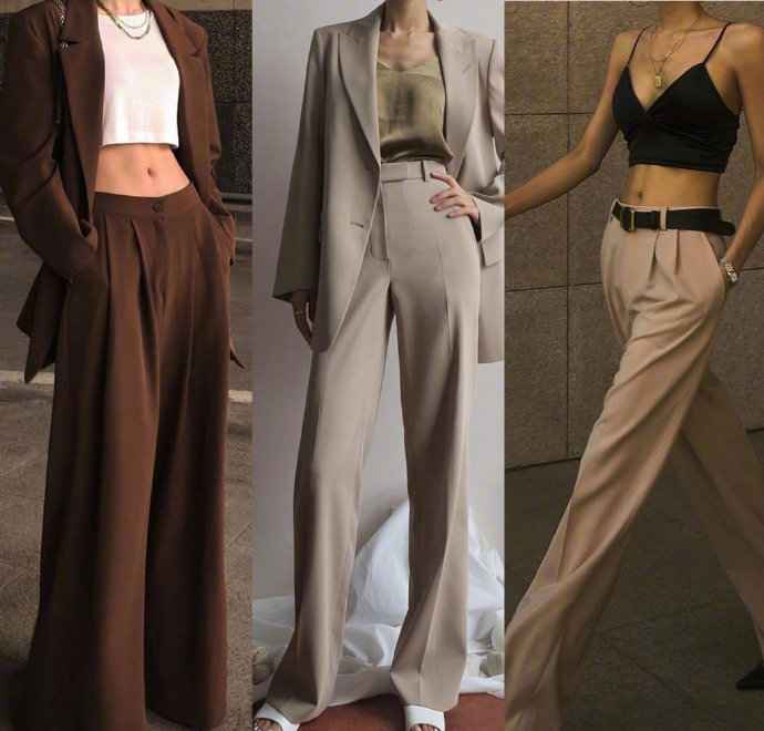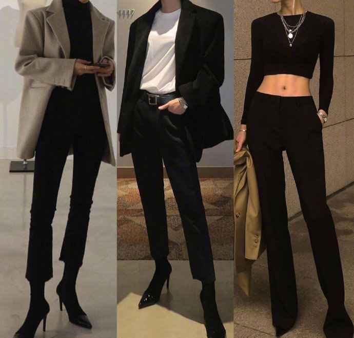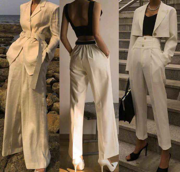 ↑这两套颜色柔和,配色雅致,加上不规则穿法,简单组合却显高级。尖头皮鞋增添女人味,让西服配粉裤更出彩。