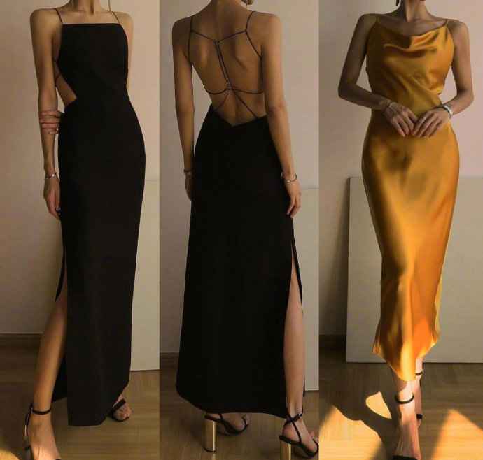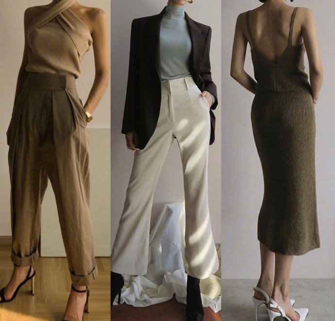 上图的单品都很基础,但处处透着高级,关键在于对色彩深浅的微妙把握,比如左边卡其色的层次,中间雾霾蓝配白裤,右边吊带裙搭尖头鞋,这些不经意的小细节最值得琢磨。
