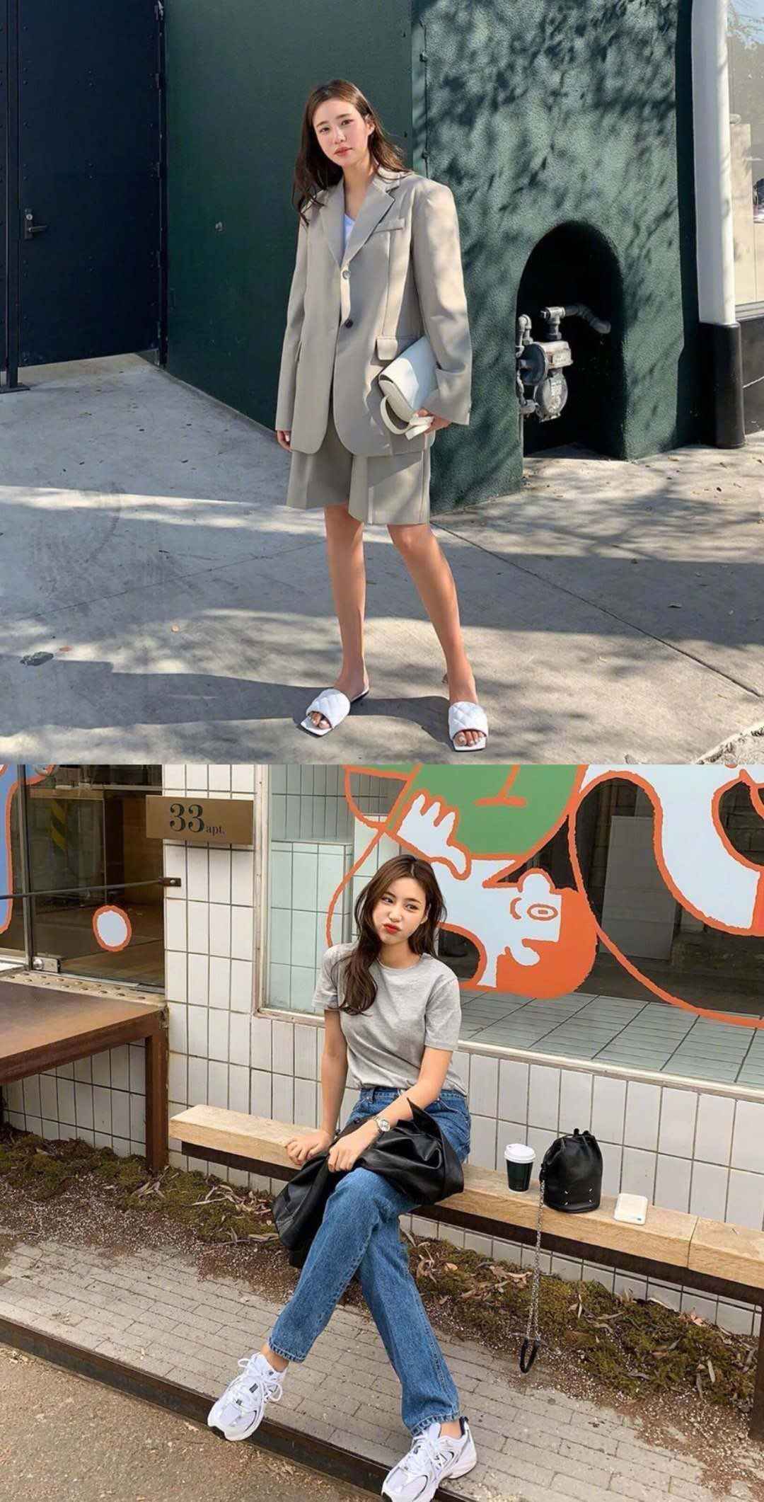 ↑这两套有意思,西服短裤套装搭小香风凉拖,看似不搭却混出高级感。灰T配牛仔裤,日常必备,靠妆容、手表等细节加分。