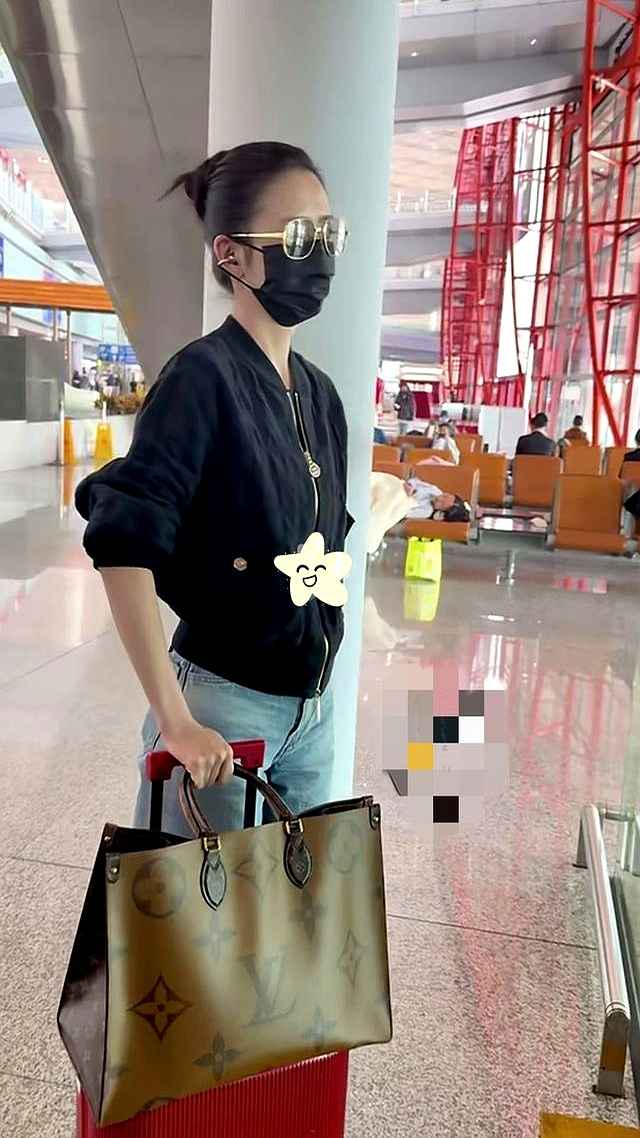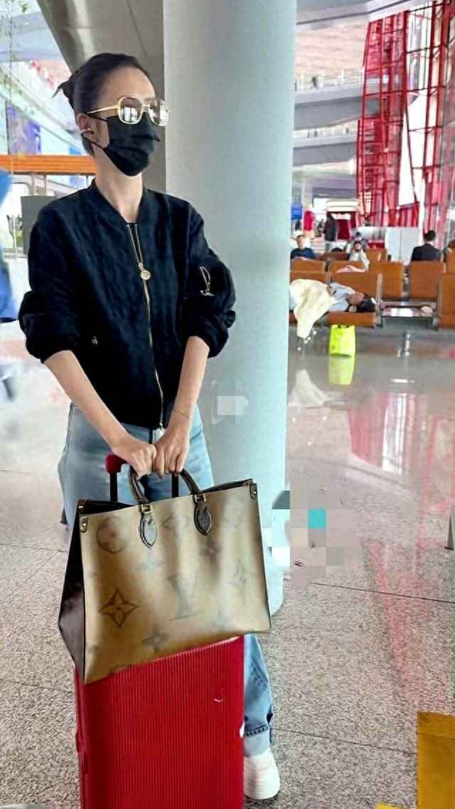现场路透的亮点很明确:头发扎起来,戴黑口罩和金框眼镜,黑色外套叠穿浅蓝色牛仔裤,推着红色行李箱,手里拎着经典印花托特包。