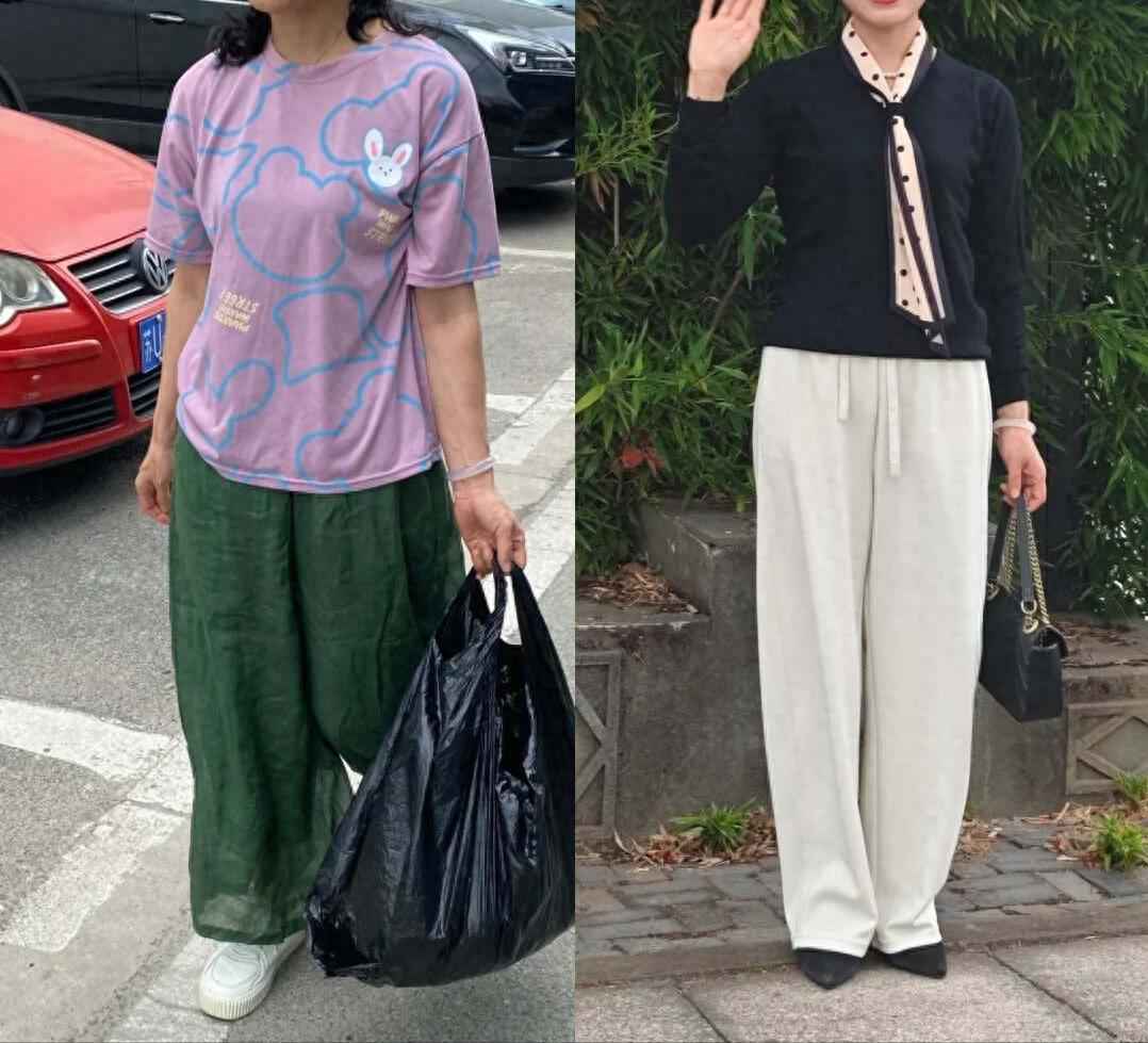 女人上了年纪,穿着要显活力精神,才能对抗岁月。宽松阔腿裤配软榻面料,腿部臃肿像面包,线条不流畅,走动时裤腿晃荡,看似舒适实则邋遢,违背优雅气质。