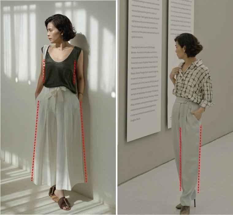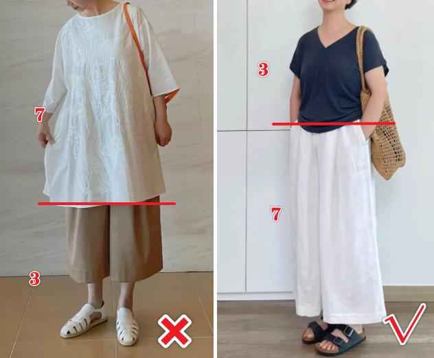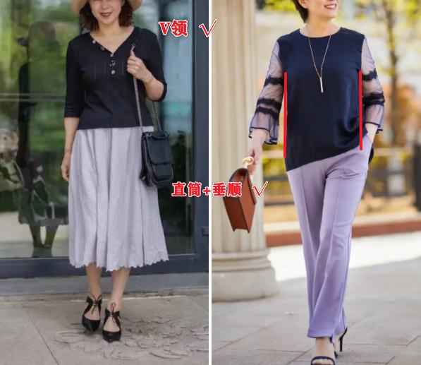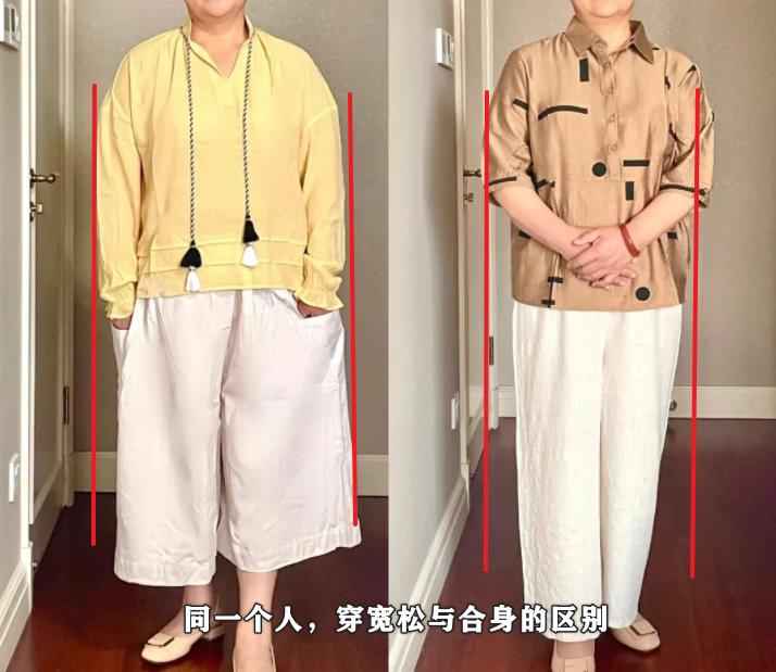 那为什么说中年女人最好别穿太长上衣和太宽裤子呢?看完这几组对比你就明白了~