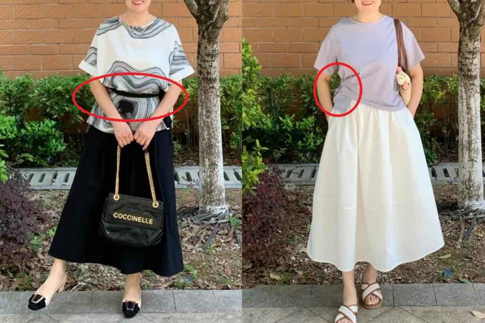 很多中年女性为了舒适遮肉,爱穿宽松的长上衣。但宽松不等于藏肉,尤其是它把腰线模糊后,身材曲线全没了,直接变成“水桶腰”。