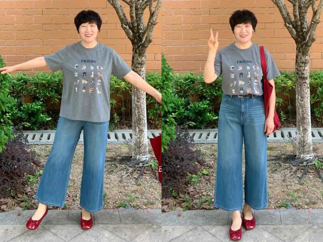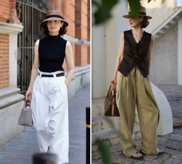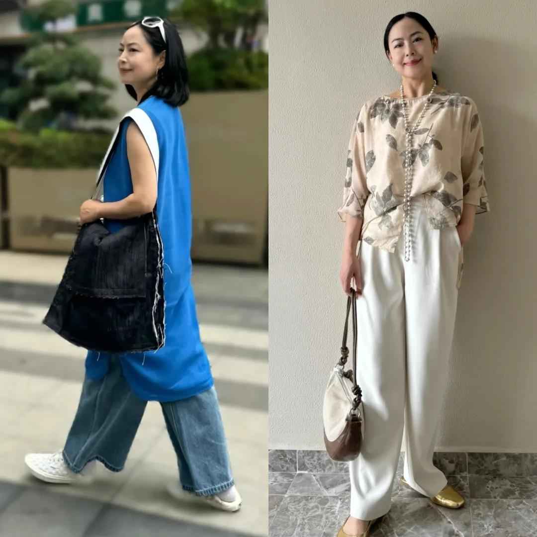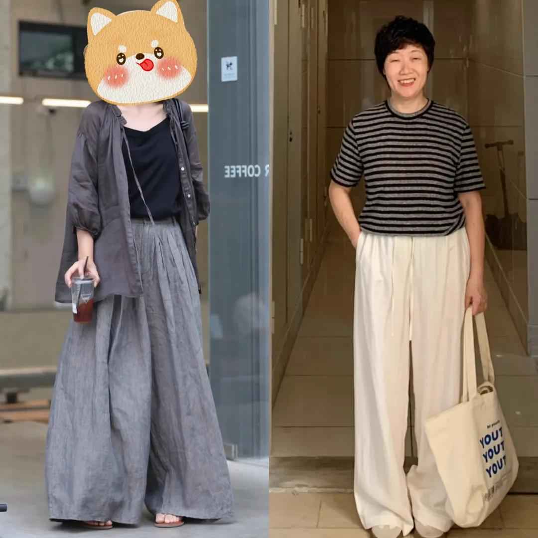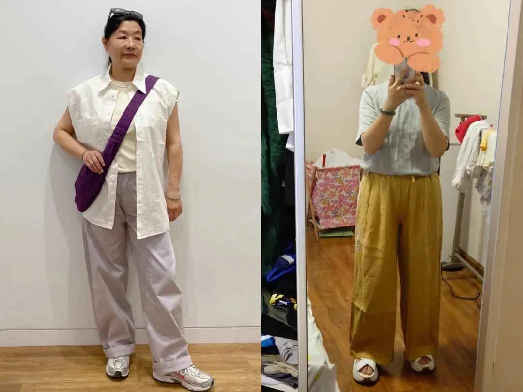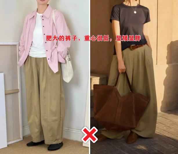 同样,阔腿裤版型太宽松,下半身重感强,不仅拉宽横向比例,还显笨重。中年女性臀宽、大腿松弛的问题会被放大,小个子穿更显矮。