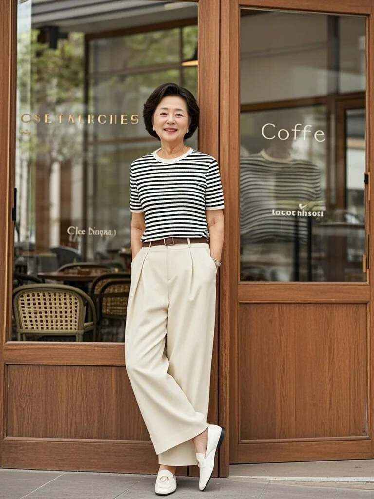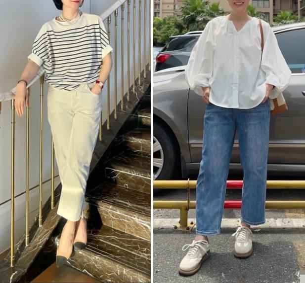 →上松下紧:宽松条纹T恤、衬衫配直筒裤,用上衣垂感遮腰腹赘肉,直筒裤拉长腿部,避免整体松垮。