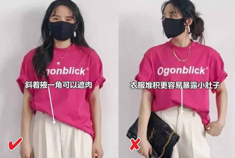 如果你觉得腰部有赘肉想遮一下,首先得避免长度超过胯骨10cm以上的上衣,优先选长度在腰到胯之间的款式,搭配大领口设计,整个人会显得更高挑显瘦。